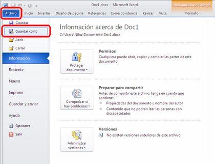 Preparar: Al hacer clic en este botón se abre un menú que proporciona información con respecto al documento actual y tiene comandos para prepararlo para su distribución.